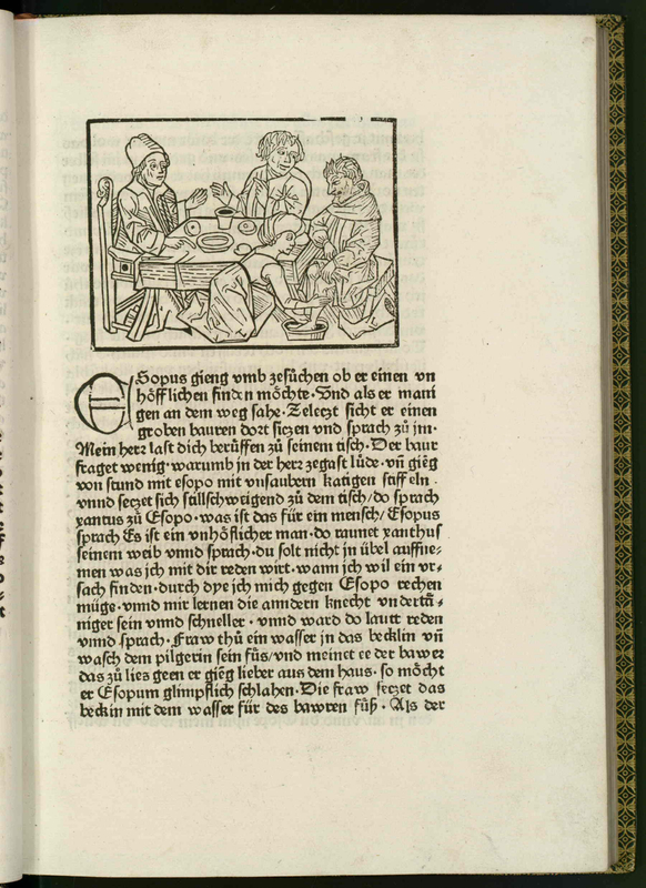 Vita et. Fabulae [Three men are sitting at the table and the third man is getting his feet washed by a person]