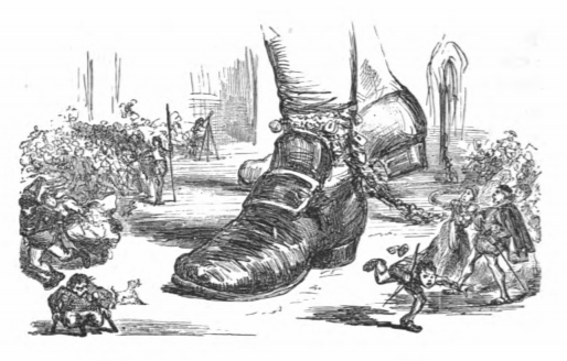 [Gulliver’s foot in a crowd of Lilliputians]