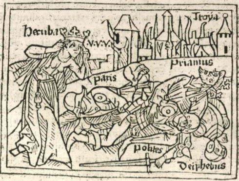 This engraving depicts Hecuba, the queen of Troy, on the left-hand side of the engraving with her hands pulling at her hair in grief as she sees her dead children and husband on the ground. We know that this is Hecuba as her name is engraved beside her head, and because she is wearing a crown. The city of Troy is illustrated in the background of the engraving, burning to the ground as it is engulfed in flames from the Greeks taking the city. The word “Troya” is engraved above the city. Her children Paris, Polites, and Deiphobus are among the figures laying on the ground. Their names are engraved in order to identify them. Priam, Hecuba’s husband, is also among those figures. Deiphobus, who’s body is in the bottom right-hand corner of the engraving, had his ears and nose cut off which is why his face is depicted the way it is in the engraving.