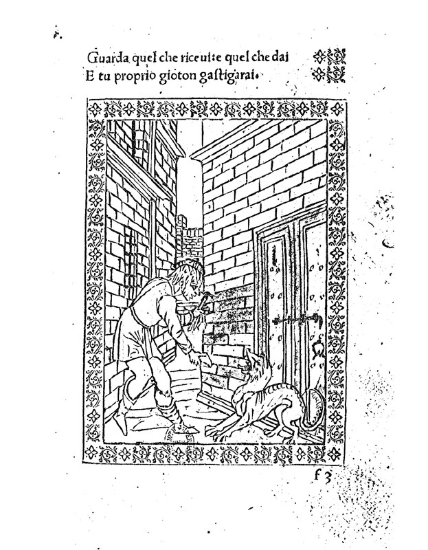 on the left side of the image a man looking frightened is in an alley way and seems to be fending off a mythical creature with what looks like a rock. On the right side There is a double door with a bar lock. All the buildings are made of brick. image is boardered with a design and a Stamped signature of Liberale de Verona is on the bottom middle of image
