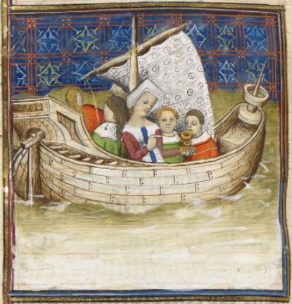 This illumination depicts Theoxena sitting on a ship with her nephews and child as they kill themselves. They are illustrated on a ship as they had attempted to escape King Philip of Macedon by sea, however, their ship was being pulled back to shore by the winds. To avoid dying at the hands of King Philip, Theoxena had given them all a choice between stabbing themselves with knives or to drink poison. Theoxena is depicted holding a chalice full of poison and forcing the children to drink it.