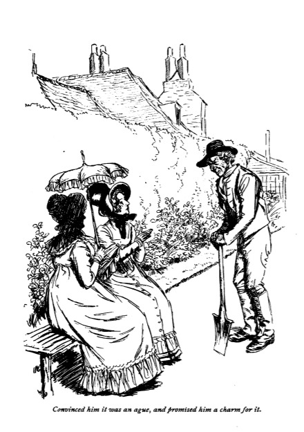 Here we see Mrs. Rushworth and Mrs. Norris speaking with Mrs. Rushworth’s gardener at Sotherton. While visiting Sotherton, Mrs. Norris walked through the gardens with Mrs. Rushworth, the lady of the house. They did not walk through the extensive grounds of the estate, choosing instead to stop and speak with the gardener about his pheasants. He showed the women the gardens, and the dairy, giving Mrs. Norris some of his famous cream cheese and a pheasant to bring home. This scene occurs in chapter 10. The characters are shown in the traditional regency style. The women are wearing regency style dresses and coats with empire waists and bonnets. Mrs. Norris holds a parasol to shade her from the sun. The gardener wears a waistcoat and long pants with a sun hat. The regency period dated to the early nineteenth century (1811-1820) when George, Prince of Wales, later George IV (r. 1820-1830), reigned as regent for his mentally ill father, King George III (r. 1760-1820). The regency period is associated with the rise of neoclassicism in art and fashion.