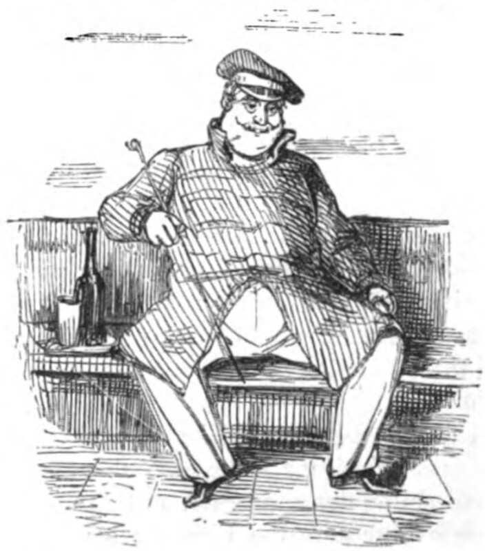 Joseph Sedley sits on the roof of the cabin on the boat from England to Belgium. Beside him on the bench are a cup and bottle of beer. He is dressed in his military coat, holding a long pipe, and looks very comfortable and relaxed.