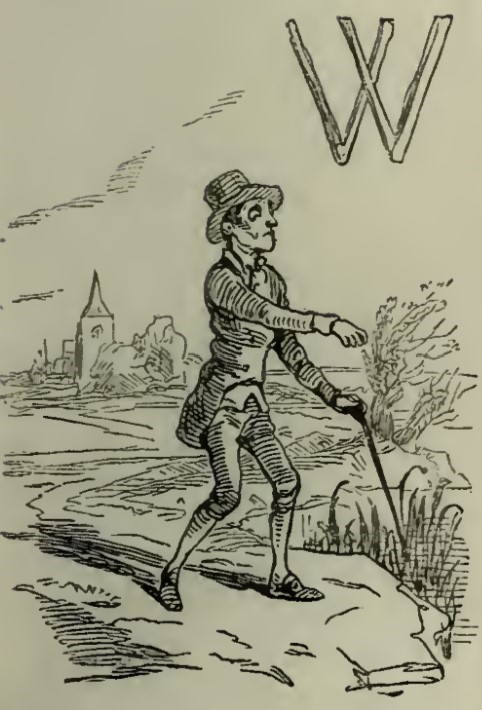 - A thin man walks along a raised path. He has his cane and free hand out in front of him, and behind him is a small town in the distance. In the top right of the image is the letter W from “We”.