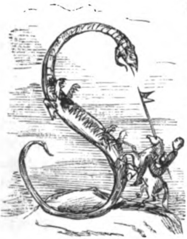 A man, representing William Dobbin, mounted on a rearing horse points a spear with a pennant at a winged serpent. The serpent, representing Mr. Osborne as Dobbin goes to inform him that his son has married against his wishes, is curved into the letter S from “So”.