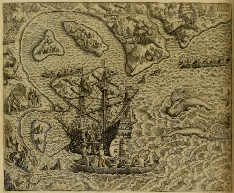 A large European ship is anchored near the coast. Several Tupinambá people in a canoe float alongside the ship, with two European men in the canoe communicating with the men on the ship. There are two other canoes nearby, and two large sea creatures swim in the open water. A group of European men have used a rowboat to go ashore. The rowboat is tied to a stake along the shoreline and the men gather around a large bonfire.