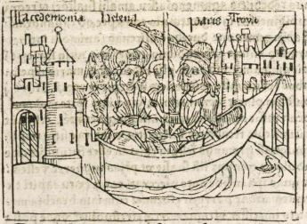 This engraving depicts prince Paris of Troy leaving the shores of Lacedaemon on a ship that contains queen Helen, wife of king Menelaus. Boccaccio explains that Paris had fallen in love with Helen while he was a guest in king Menelaus’ home. It is debated whether Helen’s feelings towards Paris were mutual and she willingly went with him, or if he had taken her by force. This image depicts Paris sitting on the right side of the ship (his name is engraved above his head), and Helen sitting on the left side (her name is also engraved above her head). Lacedaemon is illustrated on the left-side of the engraving, while the city of Troy is on the right side. The ship is pointing towards Troy as that is their destination. Paris and Helen going to Troy is the cause of one of the greatest wars of all time: The Trojan War.