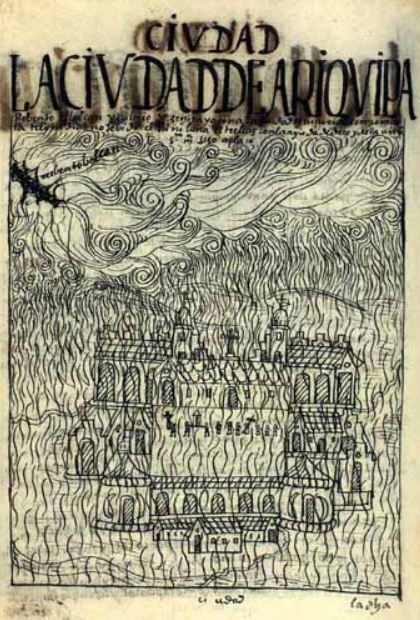 This image is depicted in the author’s chapter where he discusses cities, towns, villages, and provinces in colonial South America. This image depicts the city of Arequipa in Peru, which, according to the author, was founded by conquistador Francisco Pizarro. The city is difficult to see as it is covered in ash from the volcano that erupted. The volcano is depicted in the top left corner and is captioned with “Rebentó bolcán” [erupted volcano]. There are people visible in the town square. The author explains that many people perished in the volanic eruption, and that the city and sky was covered in ash for thirty days. The caption at the bottom of the image reads “ciudad” [city].