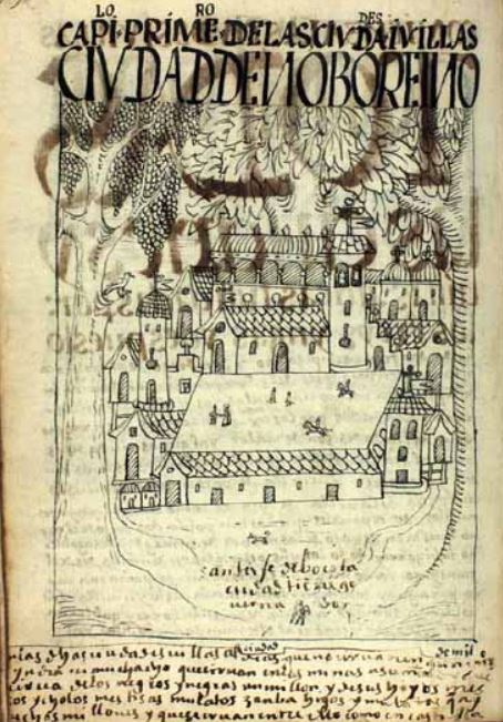 This is the first image depicted in the author’s chapter where he discusses cities, towns, villages, and provinces in colonial South America. This image depicts the city of Santa Fe in Bogota, Columbia. There are two trees on both sides of the image at the foreground that appear to encapsulate the large city of Sante Fe within them. The caption near the base of both trees reads, “Santa Fe de Bocotá, ciudad tiene gouernador” [Santa Fe in Bogota, the city has a governor]. The large caption at the bottom of the image reads, “[E]n las dichas ciudades, uillas, aldeas que no cirua ningun yndio [ni] yndia ni muchacho que ciruan en las minas a su magestad y que [...] cirua de los negros y negras un millon y sus hijos mes[tizos] y cholos, mestisas, mulatos, zanbahigos y mulatas que ay [m]uchos millones y que se ciruan entre ello como en Castilla” [in those cities, towns, villages that no Indians circulate the mines to their majesty and that a million blacks and their mestizo, cholo, and mulato children and they serve as they do in Castile].