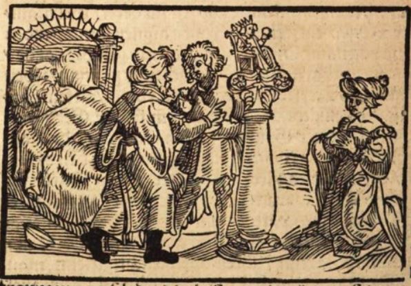 The Roman woman Paulina is depicted on the right side of the engraving as she kneels in prayer. She is looking up at the statue of the Egyptian god Anubis, which is sitting on a tall platform. Paulina was an incredibly devout and chaste woman and was completely faithful to her husband. A man named Mundus had fallen in love with Paulina due to her overwhelming beauty, and when she continuously rejected his advances, he devised a plan to have her as his own. Mundus is depicted in the centre of the engraving handing a bag of money to a priest. Mundus bribed the priest of the temple to convince Paulina that if she spent a night in the temple, she would have an encounter with the god Anubis in her sleep. Paulina naively stayed at the temple expecting to have an experience with Anubis, however, Mundus came to Paulina in her sleep and pretended to be the god and convinced her to have intercourse with him. This is depicted on the left side of the engraving. Paulina and Mundus (disguised as Anubis) are illustrated in bed together after having intercourse. Paulina is famous for having been tricked into losing her virtue and chastity. Mundus ended up being exiled, and the priest was tortured for his involvement in the deception.