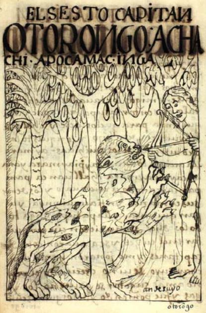 This illustration depicts the sixth captain, Otorongo Achachi who was also known as Apu Camac Inca. These captains were a level of Inca authority who helped lead the conquest of the Andes. This captain was the son of Inca Roca, the sixth king of the Inca Empire. The author explains that a lord had told this captain that in order to successfully conquer he must become an Otorongo [Jaguar]. This is why the author has illustrated a jaguar in this image. There is a person on the right-hand side with an arrow pointed at the jaguar. The words “ande suyo” are written at the bottom of the image which describes the regions that this captain had conquered.
