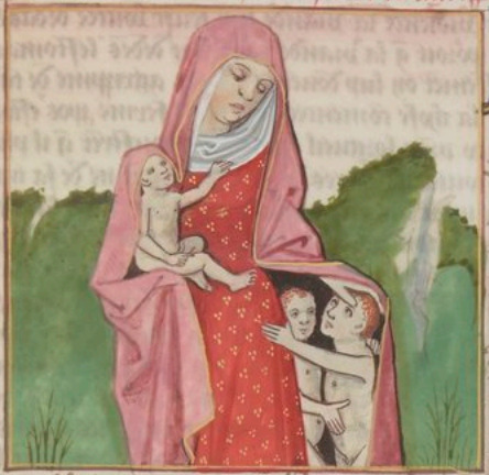 This illumination depicts a woman named Agrippina with her three children. She is illustrated holding one child in her arm and looking at her other two children who are standing by her legs. Agrippina was famous for being the mother of the emperor Caligula. She bore her husband, Germanicus, a total of three sons, all of whom are illustrated in this image.