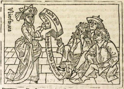 This engraving depicts Nicostrata, a woman who was a famous prophetess during her time, holding a scroll of parchment. We know that this is Nicostrata as the creator engraved her name horizontally adjecent to her body. Nicostrata had gone with her son, Evander, to Italy and he founded the city of Pallantium. Boccaccio explains that once Nicostrata realized that the inhabitants of this city were not well educated or literate, she decided to give them their own language with their own letters and symbols. This was the Latin language. Nicostrata taught the new letters and language to the people of Pallantium, which is what the engraving depicts. There are people sitting on the ground who are listening intently to the prophetess, as she is holding the parchment and pointing at the letters.