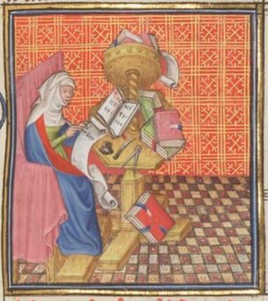 This illuminated image depicts the sibyl, Amalthea (also called Deiphobe), sitting down while looking at a book resting on a lectern as she writes on parchment. Amalthea is famous for having had nine books to give to the Tarquinius Priscus, however, when he denied her payment, she began burning three books at a time until he gave her the money. There were three books left when he paid her. These three books contained all the future events that will happen to the Romans. This is most likely what she is writing in this image.