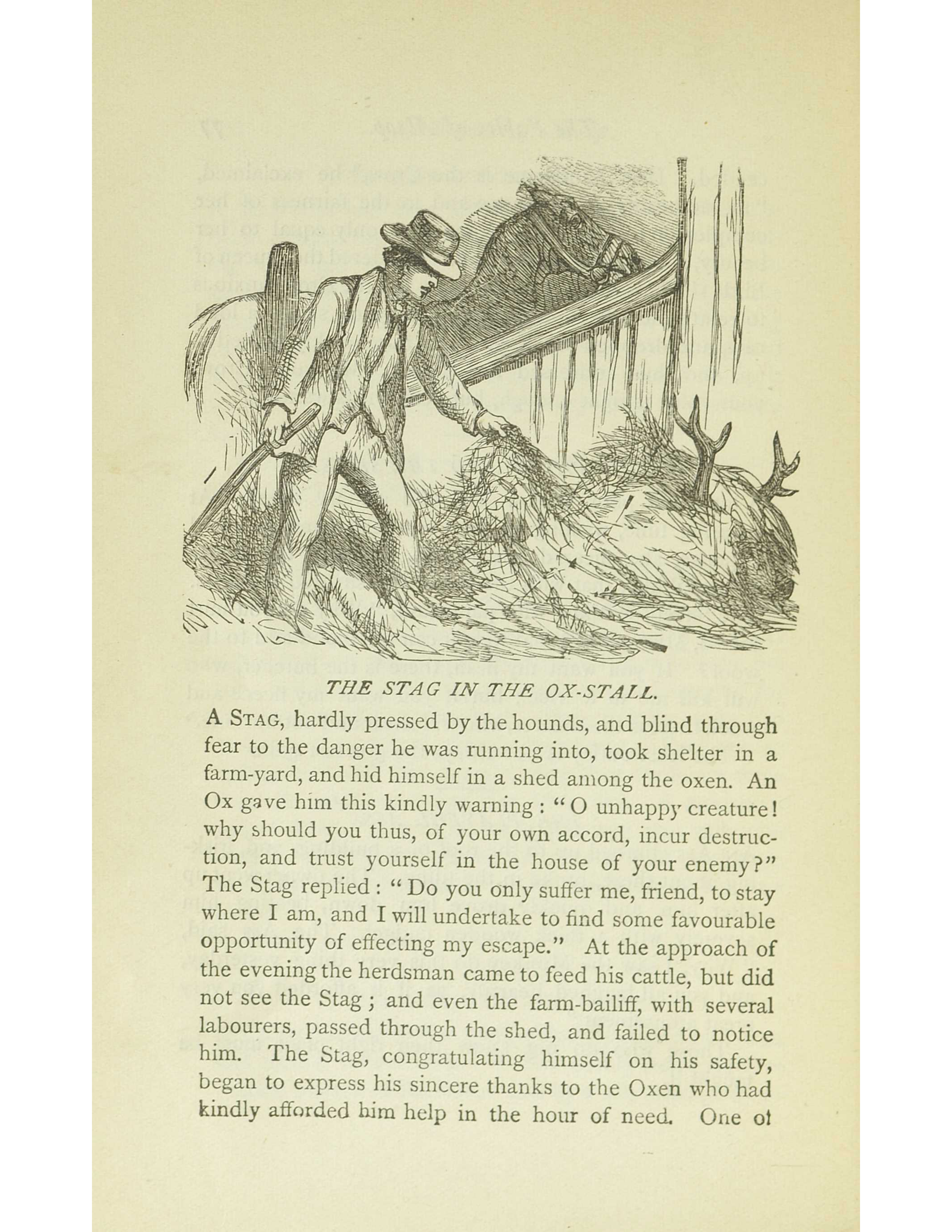 A man wearing a suit and a hat is holding a stick in his right hand, while he is moving hay off the sleeping stag. The body of the stag is not visible, but both its horns are sticking out of the hay as seen in the lower right corner. Behind the man and the stag, a horse is looking at them from its stall in the stables.