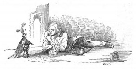 Here we see Gulliver lying on the ground speaking with the Emperor. The Emperor is identified by his cape, helmet with three large feathers, and swords. Gulliver explains his experiences to the Emperor. The same image appears in both the 1839 and 1843 Krabbe editions.