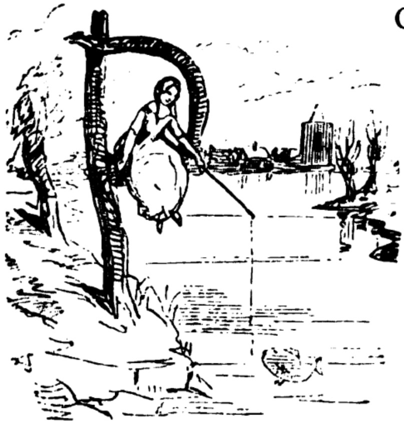 A female figure, representing Becky Sharp, is seated in a wooden letter P of “Poor” on the banks of a stream or river. She holds in her left hand a fishing rod, which has attracted the attention of a single large fish, representing Joseph Sedley. In the background are several trees and the shapes of buildings in a city or town in the distance.