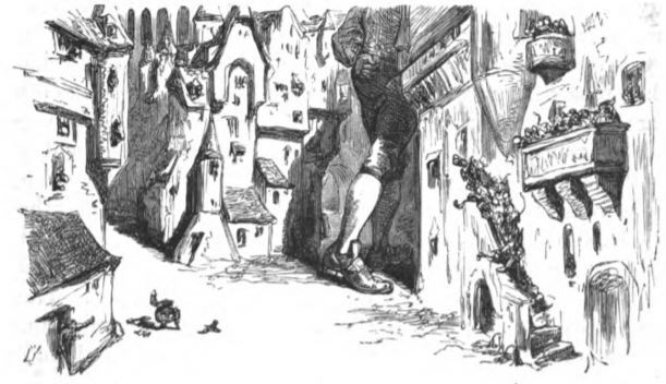 This image depicts Gulliver walking through the streets of Lilliput. Only the lower half of his body is depicted to show the difference in size between him and Lilliput. Gulliver is walking in between buildings as he hides from the invading Blefuscu enemy fleet.