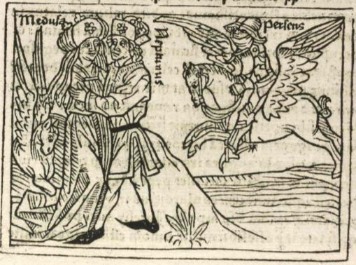 Medusa is illustrated on the left-hand side of the engraving embracing the god Neptune. The creator engraved Medusa and Neptune’s names beside their bodies to identify them. Medusa is depicted in her human form in this engraving before Minerva transformed her into a monster. Boccaccio explains that Minerva transforms Medusa into a monster because she was angry that she had sexual relations with Neptune inside one of her temples. Boccaccio also explains that Medusa ends up giving birth to a Pegasus, which is engraved just behind Medusa on the left-hand side of the engraving. The hero Perseus is depicted riding his Pegasus on the right-hand side of the engraving as he is on his way to conquer Medusa’s kingdom. Perseus’ name is engraved to the right of his helmet.