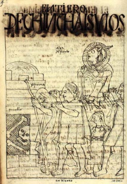 This image depicts the burial traditions of the people in the Chinchaysuyos region of the Inca Empire. The author explains that the burial would take place five days after the death and the citizens would hold a procession where they carry the body adorned in garments. The dead body is depicted being carried on a plank of wood over the shoulders of two men. The dead man’s yquima [widow] is illustrated looking at the ground, holding a stick as she cries for her husband. They are illustrated taking the body to the pucullo [tomb] on the left side of the image. There is a skeleton illustrated on the pucullo to demonstrate that it is a tomb. There is a caption at the top of the image which reads “aya defunto” [deceased] and a caption at the bottom which reads “enterrio” [burial].