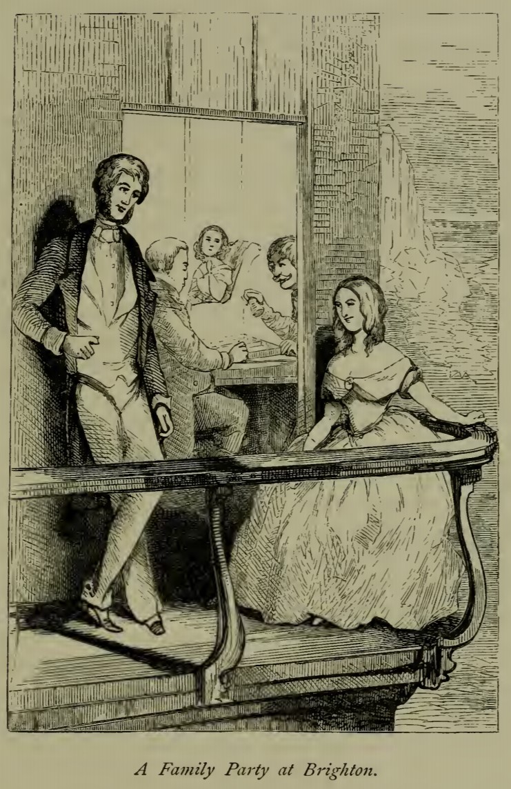 George Osborne and Rebecca Crawley are on the balcony of the inn at Brighton, looking at the ocean. He is leaning against the building, facing out, while she is seated by the railing, facing him. Through the doorway, Joseph Sedley and Rawdon Crawley can be seen inside at the table, playing backgammon. In the far background, Amelia Osborne is sitting alone in an armchair, looking forlornly at the others. Below the illustration is printed its title, “A Family Party at Brighton.”
