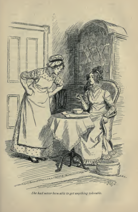 Here we see Emma eating a bowl of gruel while her cook stands by. In this scene, Emma remembers one of her past cooks, thinking how she could not make tolerable gruel. What she made was already too thick or too thin. This scene occurs in chapter 12. The characters are shown in the traditional regency style, with Emma wearing the regency style dress with an empire waist. The cook wears a long apron over her dress and her hair tied up underneath a mop cap. The regency period dated to the early nineteenth century (1811-1820) when George, Prince of Wales, later George IV (r. 1820-1830), reigned as regent for his mentally ill father, King George III (r. 1760-1820). The regency period is associated with the rise of neoclassicism in art and fashion.