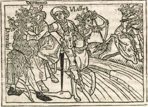 Hercules is depicted on the left-hand side of the engraving holding his new wife Deianira in his arms as they attempt to cross the Evenus river. Hercules is illustrated with a wreath on his head and a bow and arrow by his legs. His name is engraved horizontal to his body in order to be identified. Deianira is illustrated wearing a crown and has her name engraved above her head. A man named Nessus is depicted beside Deianira, holding his arm out to her as he offers to take her across the river. Boccaccio explains that Nessus was riding horseback, however, in Greek mythology, Nessus is known to be a centaur. Nessus’ name is engraved to the right of his head. Nessus betrayed Hercules’ trust, and began to run away with Deianira after crossing the river. Hercules uses a poison infused arrow to shoot Nessus and rescue his wife. This is illustrated in the background on the right-hand side of the engraving. Hercules’ bow is in hand, and his arrow is sticking out of the chest of Nessus.