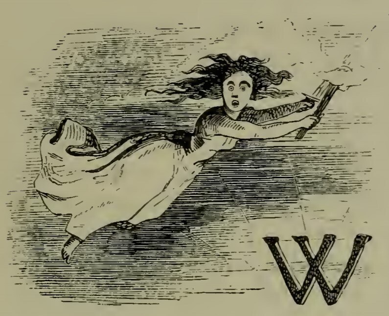 A woman in a long gown with loose, wild hair flies through the sky, looking at the reader with bulging eyes and an open mouth. She is holding out in front of her two swords or long daggers. At the bottom right of the image is the letter W from “We”, with bright rays coming out from it as if it were the sun.