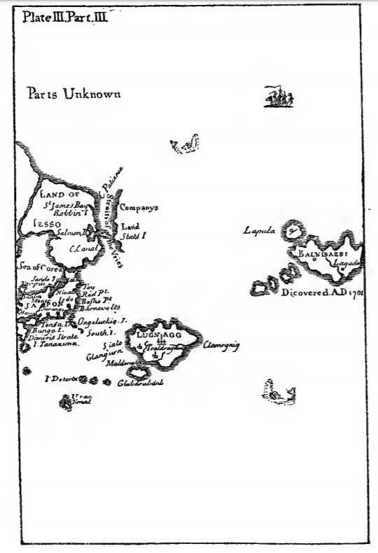 Here we see a map of the countries Gulliver visited in the third part of the book. These include Laputa, Balnibarbi, Luggnagg, Glubbdubdrib, and Japan, among others. Underneath Balnibarbi we see “Discovered AD 1701”. We also see several ships drawn on the water.