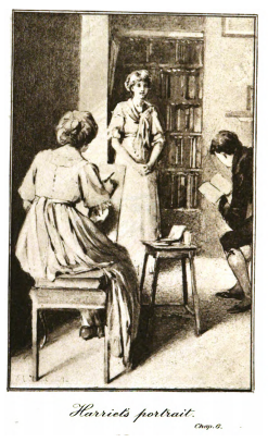 Here we see Emma drawing Harriet’s portrait. Mr. Elton sits to the side, reading out loud to entertain the women. Emma was being a matchmaker, trying to set up Harriet and Mr. Elton. He encouraged Emma to do Harriet’s portrait and was very flattering of the portrait and Harriet’s beauty. Emma took this as a sign of his romantic interest in Harriet, but in reality, he was interested in Emma. He offered to take the portrait to London to have it framed. With Emma’s encouragement, Harriet fell in love with Mr. Elton, but he proposed to Emma and she refused. This scene occurs in chapter 6 as noted underneath the title of this image. The characters are shown in the traditional regency style, with Mr. Elton wearing waistcoat, tailcoat, and knickers that stopped at the knee. Emma and Harriet wear the regency style dress with an empire waist. Their hair is worn tied up, as was tradition for women after their “coming out” before the queen, signaling her entrance into society. The regency period dated to the early nineteenth century (1811-1820) when George, Prince of Wales, later George IV (r. 1820-1830), reigned as regent for his mentally ill father, King George III (r. 1760-1820). The Prince of Wales was a fan of Austen’s work, and she dedicates the novel to him. The regency period is associated with the rise of neoclassicism in art and fashion. The same image appears as the frontispiece for the Dent 1893, 1894, 1895, 1896, and 1897 editions of Emma.