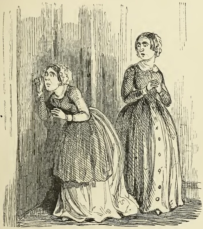 Mrs. Firkin and Miss Briggs stand outside the parlour door, listening in on the conversation between Sir Pitt Crawley and Rebecca Sharp. Mrs. Firkin has her eye to the keyhole while Miss Briggs is watching her with her hands clasped together. Both look worried.