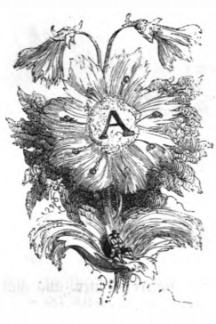 Here we see Gulliver sitting on the leaves of a flower in Brobdingnag, where everything is giant compared to Gulliver. In the centre of the flower is the letter “A” because the first word of the chapter is “auch”. The same image appears in the 1839 Krabbe edition.