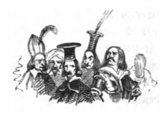 In this image we see a group of five Lilliputian officials all of whom have a disapproving look on their faces. Their status is indicated by their different forms of headpieces. Behind them we see Gulliver facing the other way, walking away from them. This image comes after Gulliver has been charged with treason forcing him to leave Lilliput. The same image appears in the 1839 Krabbe edition.