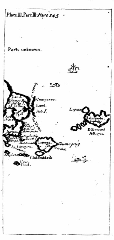 Here we see a map of the various countries Gulliver visited in the third part of the book. These include Laputa, Balnibarbi, Luggnagg, Glubbdubdrib, and Japan, among others. Underneath Balnibarbi we see “Discovered AD 1701”. We also see several ships drawn on the water.