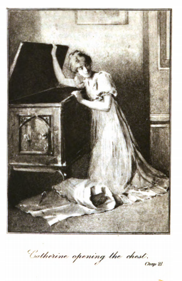 Here we see Catherine looking through a chest in her room at Northanger Abbey, Henry Tilney’s family home. Catherine came up with a story that the Abbey was haunted based on her reading of gothic novels. She saw the chest after dinner and felt compelled to see what was inside. After some struggling, she got the chest open and found several small drawers and papers inside. Catherine was excited, believing herself to be in her very own gothic novel. It was a stormy night, and a gust of wind blew out her candle, frightening her, and she jumped into bed. This scene occurs in chapter 21 as noted underneath the title of this image. The characters are shown in the traditional regency style, with Catherine wearing the regency style dress with an empire waist. Her hair is worn tied up, as was tradition for women after their “coming out” before the queen, signaling her entrance into society. The regency period dated to the early nineteenth century (1811-1820) when George, Prince of Wales, later George IV (r. 1820-1830), reigned as regent for his mentally ill father, King George III (r. 1760-1820). The regency period is associated with the rise of neoclassicism in art and fashion. The same image appears as an insert between pages 152 and 153 for the Dent 1893, 1894, 1895, 1896, and 1897 editions of Northanger Abbey.