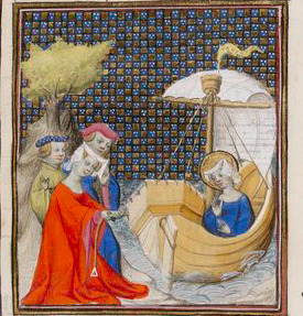 When the boat carrying the statue of Cybele got stuck in the shallow water, Claudia Quinta prayed to the goddess that if she were chaste, she should use her belt to pull the boat to shore. After praying, she ordered the other women to help her, and they successfully pulled the boat to shore. This changed everyone's opinion of Claudia Quinta, since this act displayed her remarkable chastity. Claudia Quinta is represented in the red gown, pulling the boat which is seen carrying the statue of Cybele. Beside her are two women, helping and watching as the boat comes to shore.