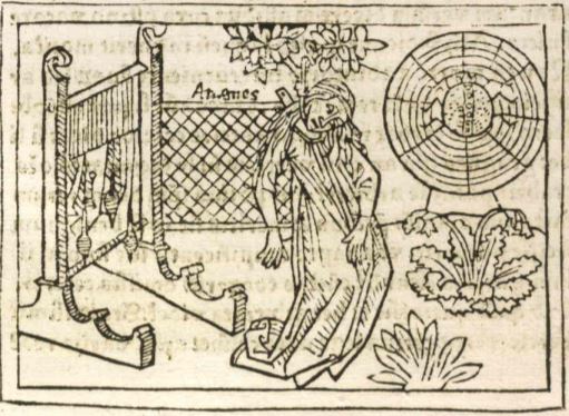 This engraving depicts Arachne killing herself by means of hanging. We know that this is Arachne as her name is engraved in Latin just beside her body. There is a loom on the left-hand side of the engraving and a net just to the right of the loom. Boccaccio explains in his story that Arachne is known by ancient writers as being the one who discovered the uses of woven wool and the first to make nets. Arachne became too confident in her wool work and challenged Minerva to a weaving competition. After the goddess had won, Arachne hung herself, as depicted in the engraving. There is a spider on a spider-web on the right-hand side of the engraving, as Arachne is said to have been transformed into a spider after this event.