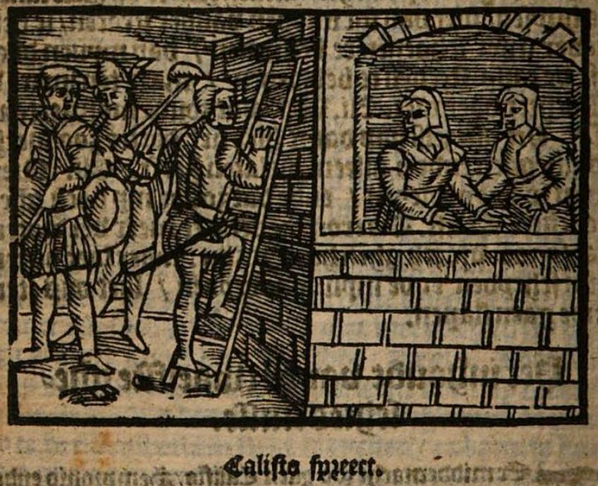 As the clock approaches midnight, Calisto leaves for Melibea’s house. He is joined by Sempronio and Pármeno, who stand guard while he speaks with Melibea through the door of her house. As he is exchanging passionate words with her, Sempronio and Pármeno overhear a noise in the street and flee, leaving Calisto unguarded. When they realize that the noise is coming from the alguacil’s men (the ‘night watch’) patrolling another street, they return to their post. However, the alguacil’s men eventually enter upon Melibea’s street, forcing Calisto and his servants to flee. To the left of the image we see Calisto, with a sword mounted on his belt, climbing a ladder. Sempronio and Pármeno stand behind him with swords and shields. To the right we see Melibea and Lucrecia looking out from a window. Both of them are wearing a robe and a veil. They seem to be making eye contract with Calisto, though perspective would make this impossible.This illustration is out of place in this act. Calisto does not climb a ladder to enter Melibea’s garden until the following day, after Sempronio and Pármeno have already been executed. I suspect that the use of this illustration (in place of the more relevant 1580 Antwerp edition illustration) may be a consequence of the 1580 woodblock being misplaced or destroyed in the intervening 36 years.The entire image is identical to those found on pages 209 and 255 of the text.
