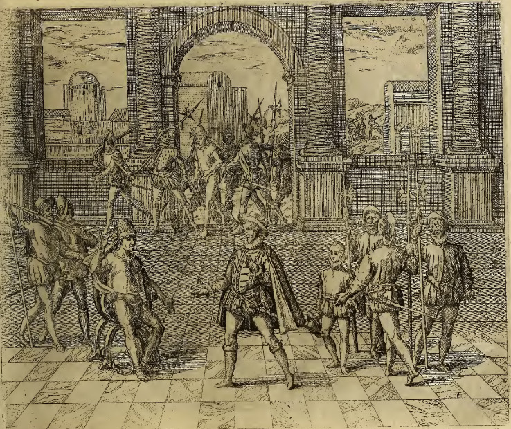 Inca Emperor Atahualpa (Atabalipa) negotiates a ransom amount with Francisco Pizarro, to secure his release from Spanish captivity. Inside a large, open room in the city Cajamarca in Peru, Atahualpa is seated on a chair with his ankles chained to the chair legs. Francisco Pizarro stands in front of him while the two negotiate. Several other Spaniards mill about the room, including a young boy. In the background, an Inca man is escorted into the building by a group of soldiers, led by a chain attached to his ankle.