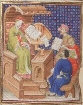 This illumination depicts the famous poetess, Sappho, sitting on the left side of the image looking at her book which is placed on the lectern in front of her. The book in front of her is assumed to be some of her own poetry. There are three men on the right side of the image who are most likely other poets. Boccaccio explains that Sappho was included among the most famous of poets.