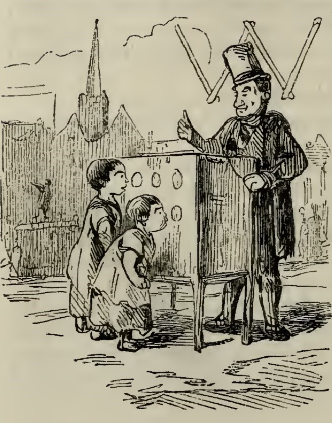 Two small children peer into the holes cut in a cabinet. Behind the cabinet stands a man in a long jacket and tall hat. Behind his head, the letter W from “Without” is formed by four sticks.