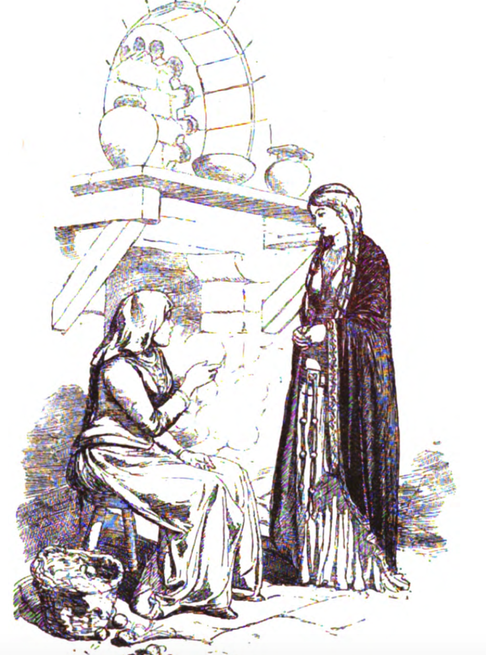There are two women in this image, Jimena daughter of the count Lozano and Bibiana a servant in the household. The one standing is Jimena and the one sitting down is Bibiana. Jimena is wearing her hair in two braids, she is wearing a dress covered by a cloak. At her waist there is a belt with fabric hanging from it. Bibiana sitting on the stool is wearing a white dress with her head covered. Next to her stool there is a basket of fruits or vegetables. Both of the women are next to a stove with a shelf on top. The shelf has three vases.