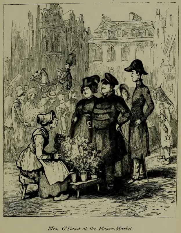 Peggy O’Dowd, in a feathered hat, stands in front of a flower seller at the market in Brussels. She is holding onto the arm of her husband, Major Mick O’Dowd, who has on a cap and is wearing his sword at his hip. Behind the pair are William Dobbin, also with his sword, and Amelia Osborne, who is in a bonnet and looking up at Dobbin. The flower seller is in a bonnet and clogs, seated on a low stool behind the table which holds her rows of potted plants. In the background of the image are the crowds of shoppers, another flower seller standing at her table of plants, a mounted officer holding a bouquet, and the tall, ornate buildings that surround the market square. Below the illustration is printed its title, “Mrs. O’Dowd at the Flower-Market.”