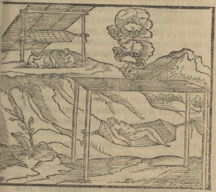 In the foreground, an Indigenous person lays on a hammock that has been strung up under a shelter. The shelter is simple, composed of four poles and a flat roof, with the hammock strung between two of the poles. In the background, two Indigenous people sit beside a fire. There is a second hammock, also strung between the two poles of a shelter, however this shelter is slanted, with on end resting on the ground and the other atop the poles. This image is identical to one found on page 8 of Venice, 1565.