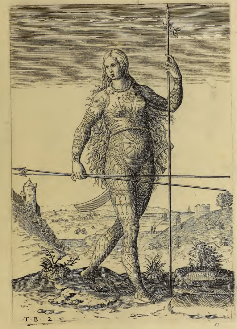 An Indigenous woman is shown from the front. She carries a spear in her left hand and two in her right. Her hair is long, she wears a twisted cord around her neck, and a sword with a curved blade hangs from another cord around her waist. She is nude, and her body is covered in painted designs. The Picts were an Indigenous group who lived in Britain long before the author’s time. Images of Picts were included in this book so that readers could compare their customs to those of the Indigenous people living in Virginia.