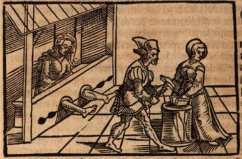 This engraving depicts the freedwoman, Epicharis, being tortured for information regarding a conspiracy to kill Emperor Nero. Epicharis is depicted on the right side of the engraving with her hands inside some form of torturing device while a man with a hammer tortures her. Epicharis is also depicted on the left side of the image with her feet restrained in a stock. Epicharis heard the details of the conspiracy to assassinate Emperor Nero, and when she put her faith in the wrong person, they told Emperor Nero that she was involved in the plan. They tortured her many times; however, she did not reveal the names of anyone involved in the conspiracy. She ended up killing herself to avoid revealing the details to the emperor.