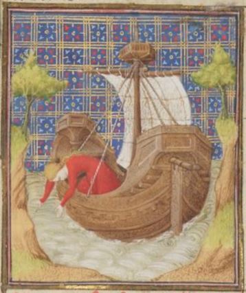 A Greek woman named Hippo is depicted on the ship in the centre of the image as she plunges herself headfirst into the ocean. Hippo had been captured by enemies, and when she heard the men discussing a plan to defile her chastity, she decided that an early death was far better than having her honour destroyed. She drowned and successfully saved her honour.