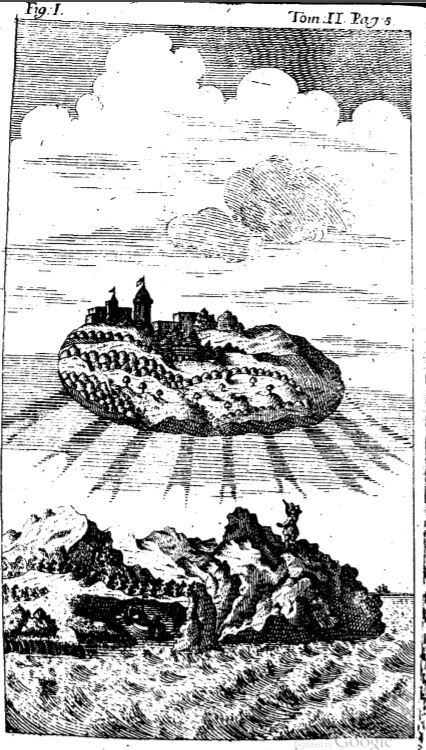 This image depicts the fictional lands of Laputa and Balnibarbi. In the foreground is the water and Balnibarbi on which Gulliver stands, looking through his telescope at the floating island of Laputa. On the island is a castle with rows of trees in front. This image is the same as that in the 1727 German von Wiering edition.
