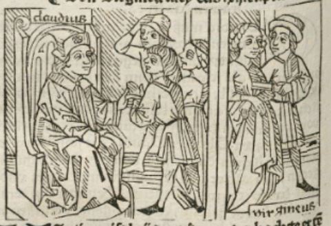 This engraving depicts the tragic fate of a young virgin woman from Rome named Verginia. Boccaccio explains that one of the decemvirs, Appius Claudius, fell madly in love with Verginia. Despite already being betrothed to another man, Claudius devised a plan to have Verginia as his own. Claudius had gotten one of his freedmen (Marcus Claudius) to capture Verginia and claim her as a slave. Verginia’s father, Verginius, went to the trial and protested the sentence of his daughter becoming a slave. Appius Claudius, however, was the judge presiding over the case, and officially decreed Verginia to be a slave. This court trial is depicted on the left side of the engraving, with Claudius sitting on the chair pointing towards Verginia, Verginius, and Verginia’s betrothed, Icilius. Claudius’ name is engraved above his head in order to identify him. After Claudius decrees Verginia to be enslaved, her father takes a knife and stabs her with it as his only way to save her. This is depicted on the right side of the engraving, which illustrates Verginius (his name is engraved below) piercing his daughter’s chest.