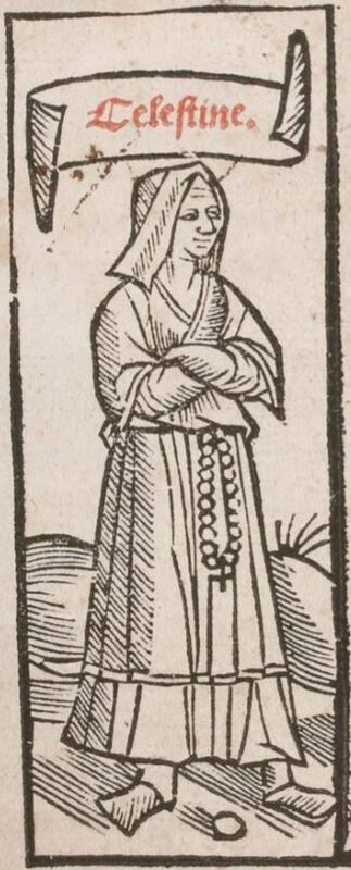 This image depicts Celestina standing outside wearing a robe and a veil, with what appears to be a rosary hanging from her waist. The entire panel is identical to the panels found on pages 70, 114, 146, 208, and 225 of the text.